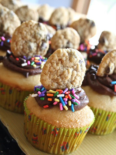 Bethany loves chocolate chip cookie dough, so we found this very cool recipe for cookie dough cupcakes. Made with a cake mix and a cookie mix. Easy peasy. You can make them with any combination of cake flavor (or brownies!) and cookie flavor, scratch or mix, really. And put anything you want or nothing at all on top of them. The real wow is on the inside.